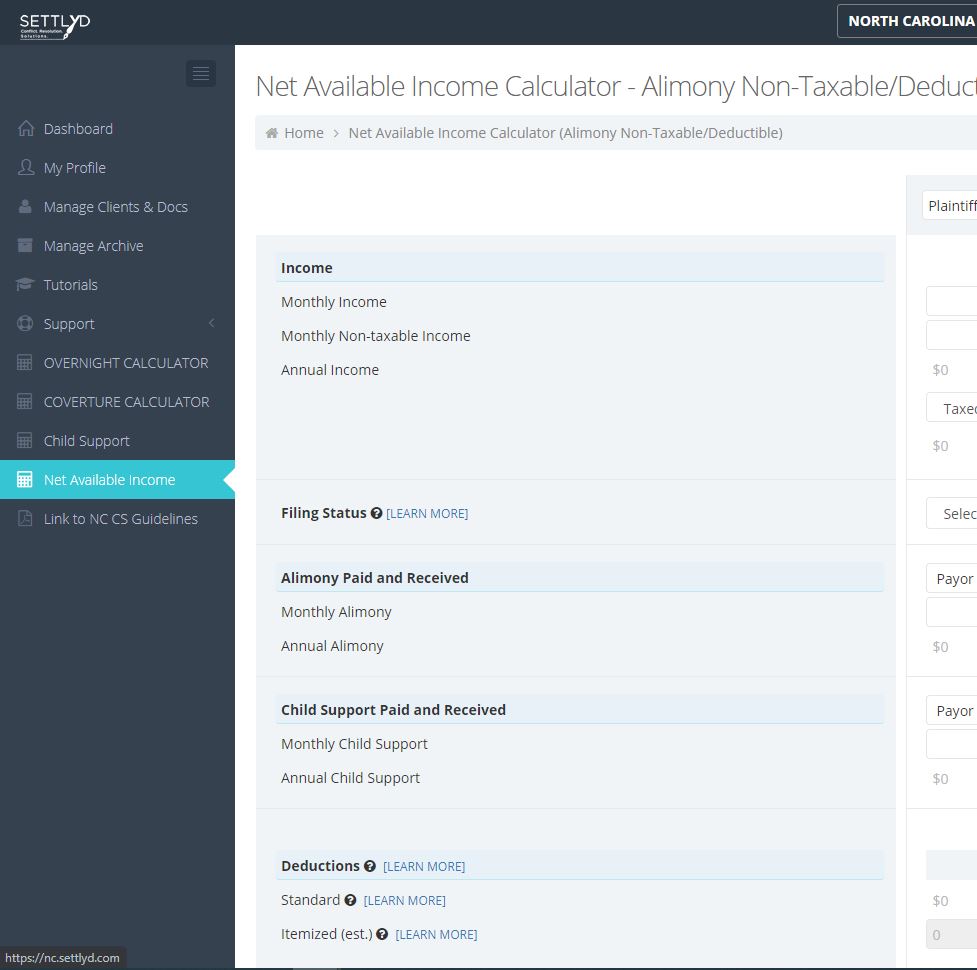 Free 30 Day TrialThis entitles 3 users to full access to all components of the site: All Financial Affidavits, all Child Support calculators, Net Available Income analysis, Asset Division analysis, remote client capability, all specialty calculators, and all other features of the site. You can enter as many separate client matters as you desire and all data is saved in the cloud for access wherever you have internet access. This is billed monthly.